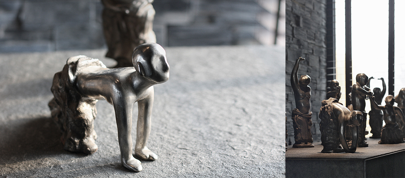 当空间被“稻草”所形成的灰色调的背景完成后,其它灵动的空间节点便是靠一些质感丰富的物件摆设来担当角色,进一步营造空间气氛。例如窗台一组晨练中的“易筋经”雕塑群,在侧窗一缕光线的作用下,原本形态模糊的头部呈现出的表情格外出彩和丰富。抛开理性创作因素不说,设计者更愿意相信这种景象是一种巧合,巧合在于:此时,此地,而后此景。