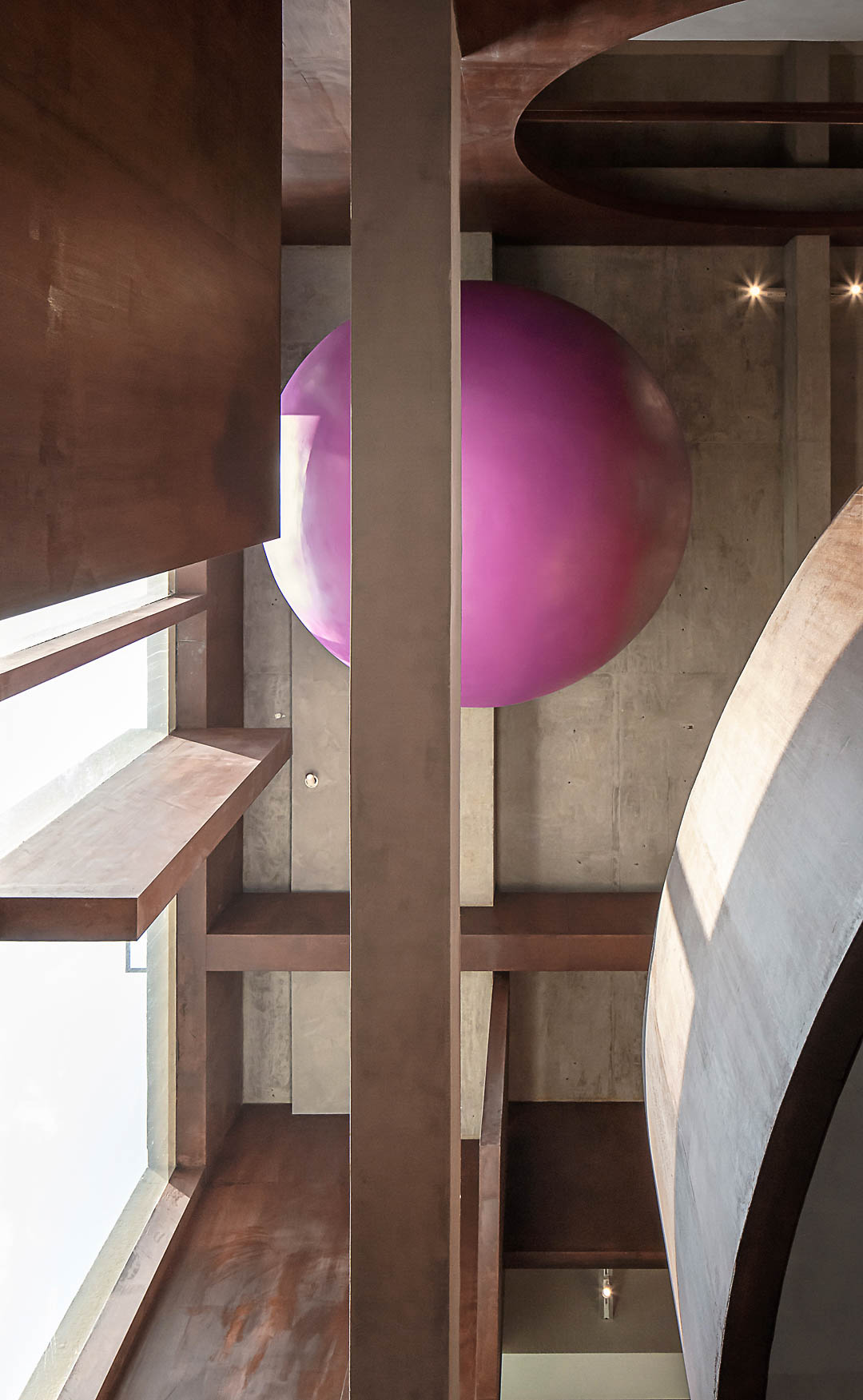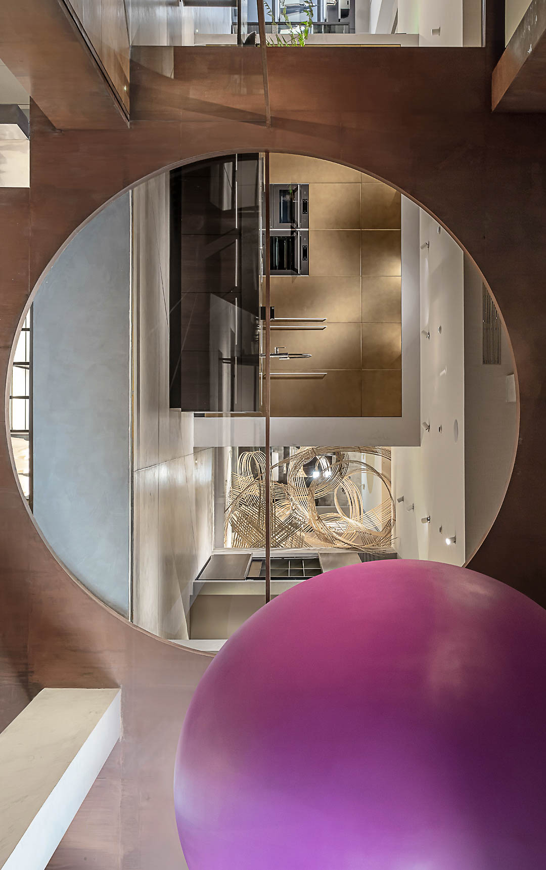 主通道旋梯部分的球体装置成为整个空间的点睛之处,悬挂在半空中的球体,让空间旋律更为丰富,营造神秘感,意念延展无尽。