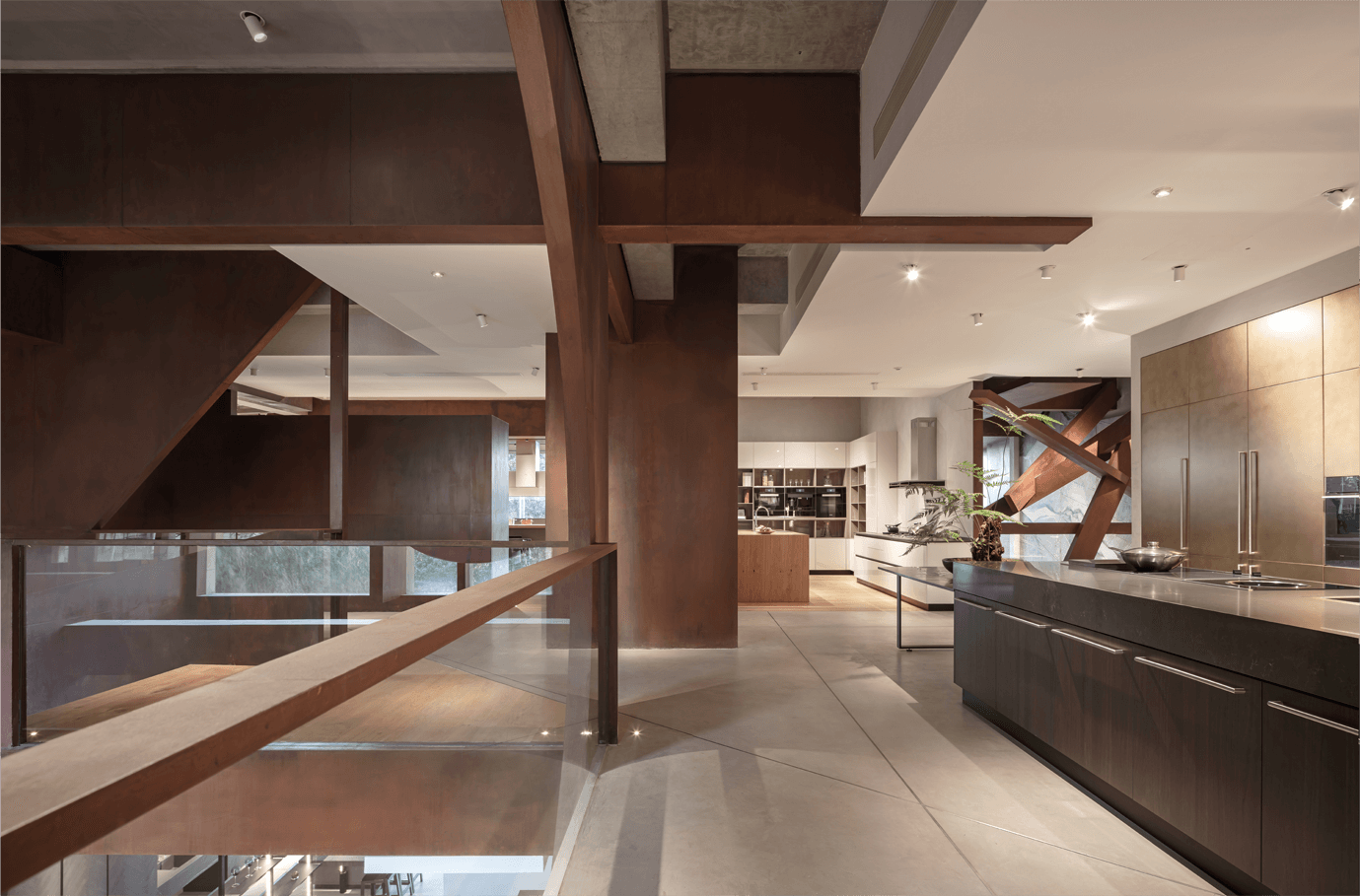 建筑的外墙改造,延续原有建筑结构的力量与节奏感,选用耐候钢板自然形成的锈纹和无缝拼接的工艺,铸造成一个独特的建筑雕塑体,从室外延伸到室内构架成整体的空间。